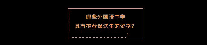 目前,具有推荐保送生资格的外国语中学共16所。分别为:天津外国语学校、石家庄外国语学校、太原外国语学校、长春外国语学校、上海外国语大学附中(含浦东、浦西校区)、南京外国语学校、杭州外国语学校、厦门外国语学校、南昌外国语学校、济南外国语学校、郑州外国语学校、武汉外国语学校、广外附设外语学校、深圳外国语学校、成都外国语学校、重庆外国语学校。