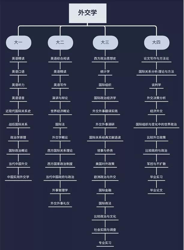 本专业根据国家和社会需要,培养德智体全面发展,具有全球视野、扎实的专业基础、过硬的语言技能、良好的跨文化交际能力和较高的综合素质,适合在党政机关、企事业单位和国际组织从事外交、外事及对外宣传工作的外交学专门人才。(对外语能力要求较高)