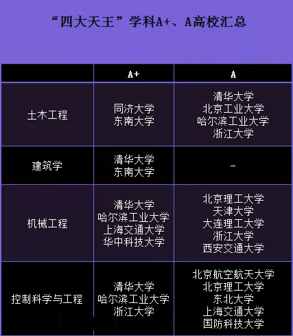 “四大天王”中自动化系的一级学科为“控制科学与工程”。四个专业获评A+和A的共有15所学校,除了清华这样的“大佬”四个专业中3个都是A+,也有一些低调的院校,专业成绩也很不错,下面我们就来一一盘点。