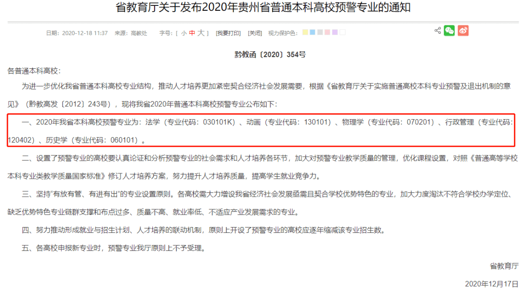 2020年,贵州省教育厅将 法学(专业代码:030101K)、 动画(专业代码:130101)、 物理学(专业代码:070201)、 行政管理(专业代码:120402)、 历史学(专业代码:060101)等专业列为预警专业。