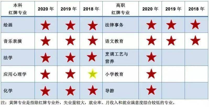 注:红牌专业指的是失业量较大,就业率、薪资和就业满意度综合较低的专业。这与相关专业毕业生供需矛盾有关。红绿牌专业反映的是全国总体情况,各省区、各高校情况可能会有差别。