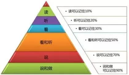 学习金字塔是美国缅因州的国家训练实验室的研究成果,是由学习专家爱德加·戴尔1946年提出的。它形象地呈现出不同学习方式所获得的不同的学习效果。
