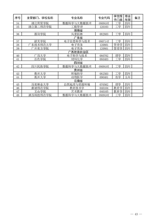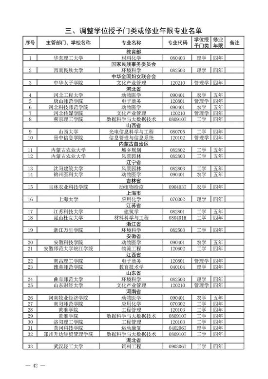 以下为2021年调整学位授予门类或修业年限专业名单(48个)