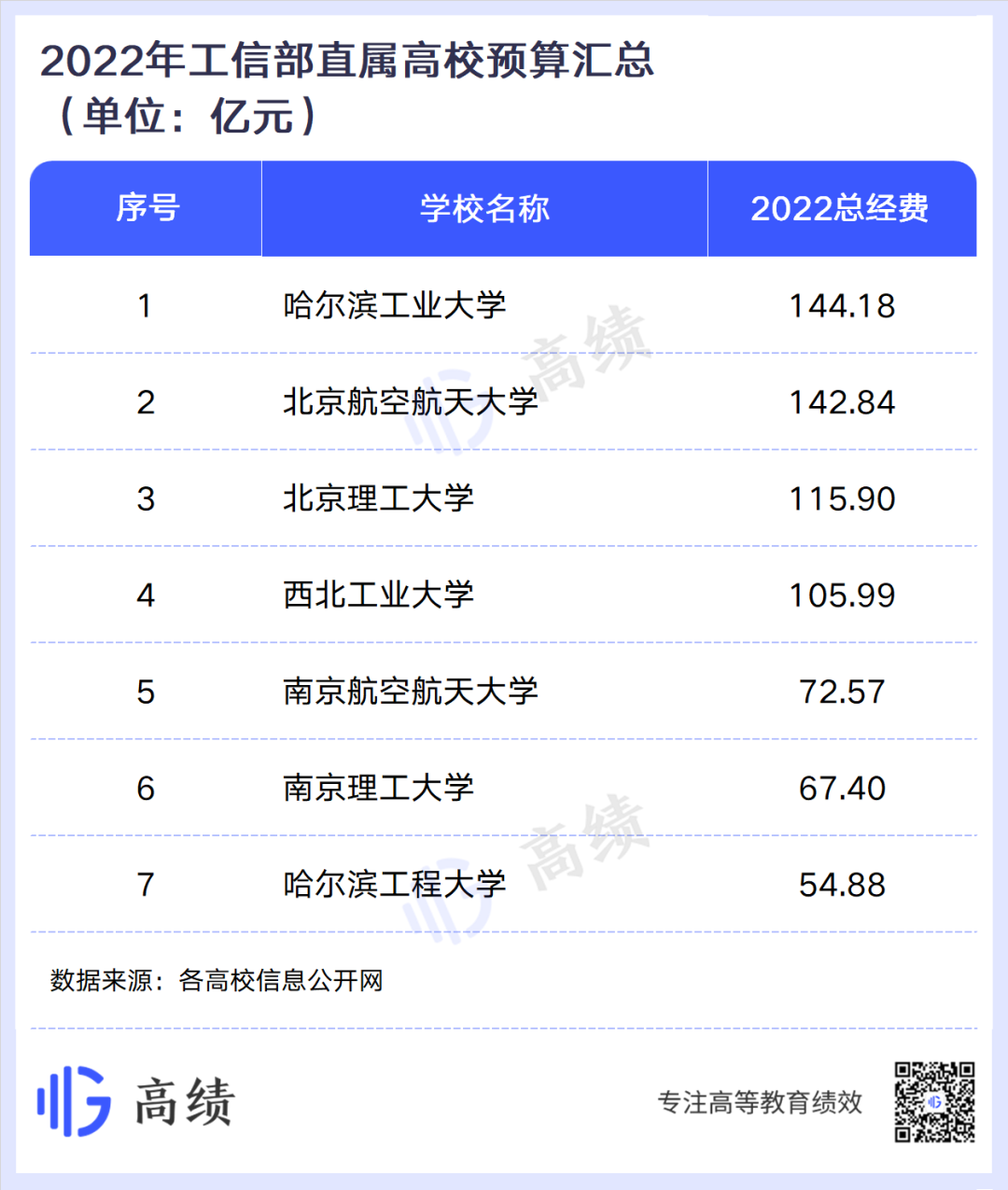 7所工信部直属高校中,哈尔滨工业大学经费预算最高,约为144.18亿元;北京航空航天大学位居第二,约142.84亿元;经费预算超过百亿元的还有北京理工大学和西北工业大学,分别为115.9亿元和105.99亿元。南京航空航天大学、南京理工大学和哈尔滨工程大学经费预算均超过50亿元。