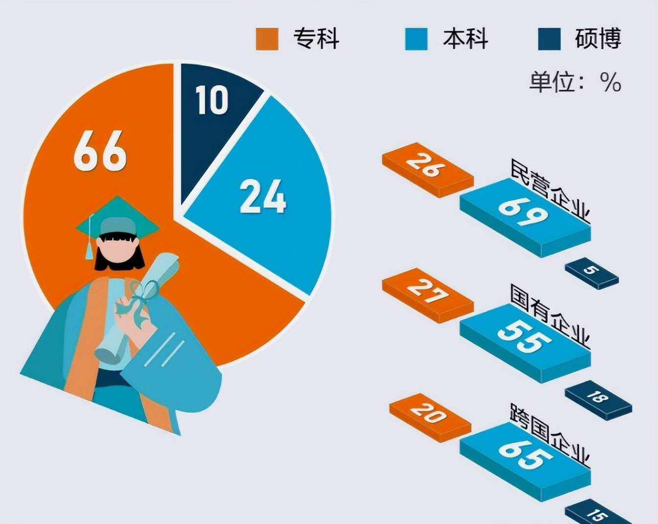 高达66%,对于本科学历的大学生需求占比是24%,对于硕博学历的大学生需求占比是10%,就算是这样,学历也是大学生就业的重要敲门砖。
