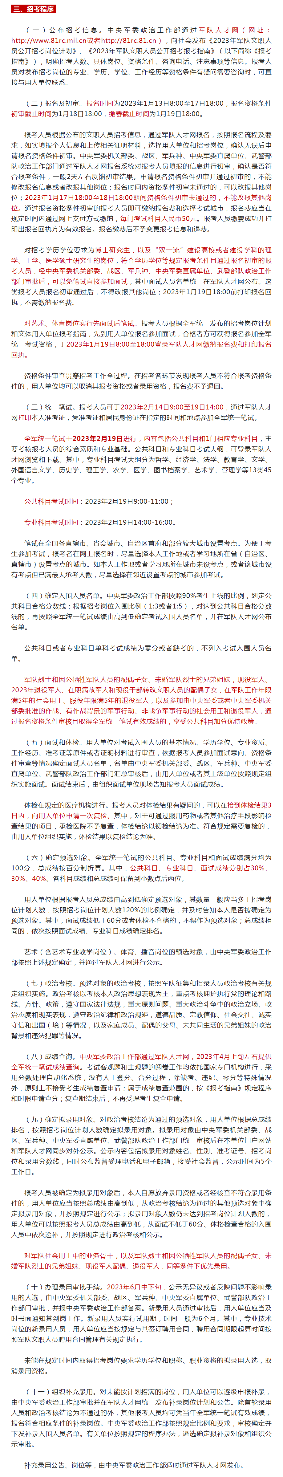 统一笔试:报考人员可于2023年2月14日9:00至19日14:00,通过军队人才网打印本人准考证,凭准考证和居民身份证在指定的时间和地点参加全军统一笔试。