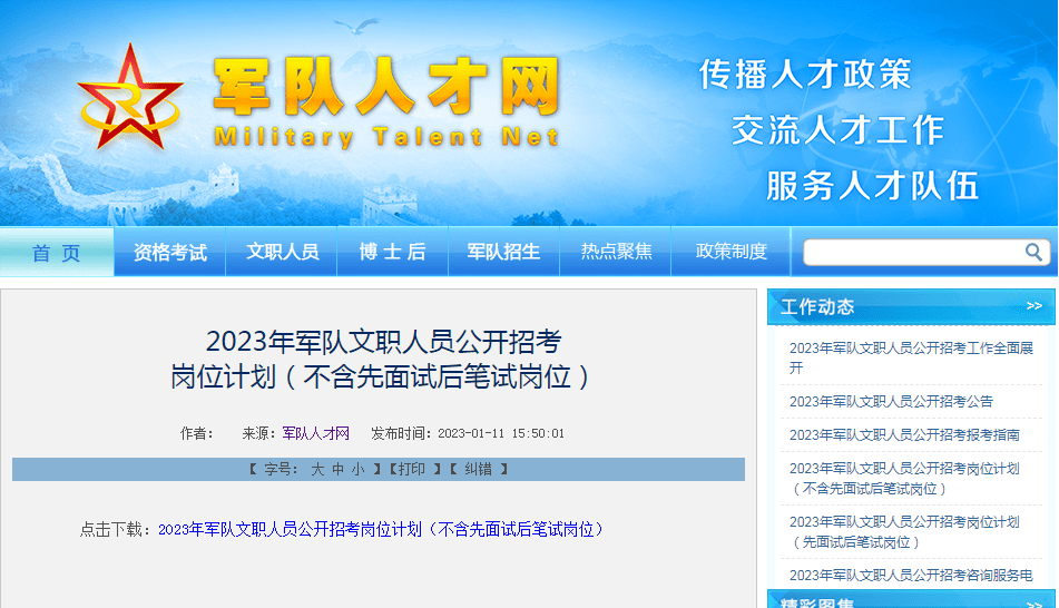 近日,军队人才网发布了2023年军队文职人员公开招考相关资讯,涉及招考人数、具体岗位、资格条件等。小编整理了本次招考关键内容,以方便有报考意向的同学查阅,当然它也能给咱高考生填报志愿一些启示,一起看看吧!