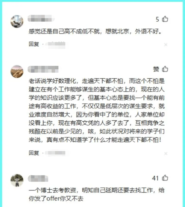 这位女博士的经历让人看后有些同情,难道文科生这么高的学历也要经受这样的待遇吗?那考名校的意义在哪里呢?有网友经过理性分析,给出的评论一针见血。