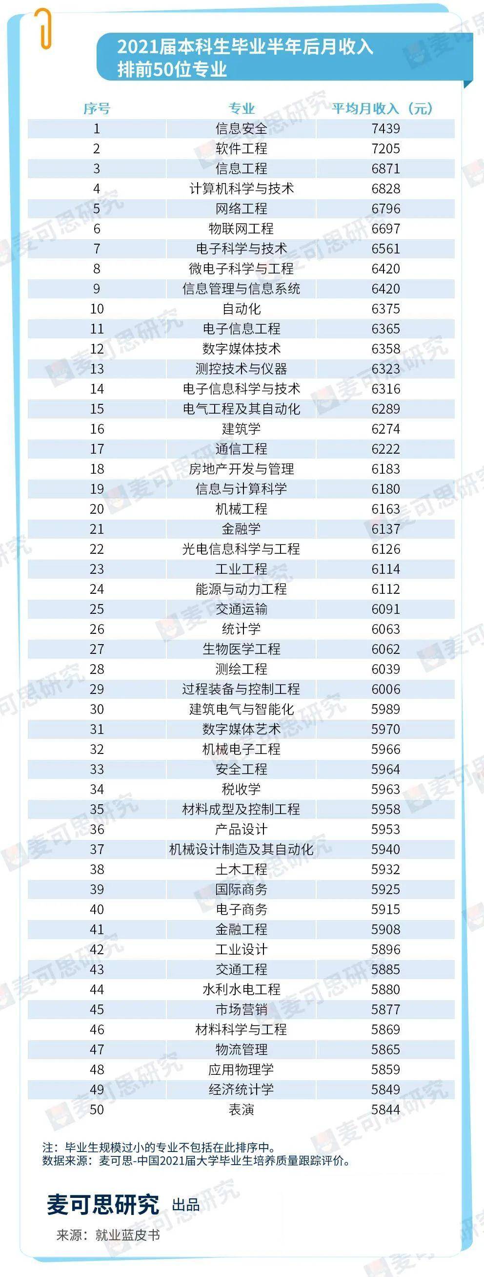 起薪较高的50个专业均超过了本科平均水平(5833元),排在末位的表演则以5844元低空过线。