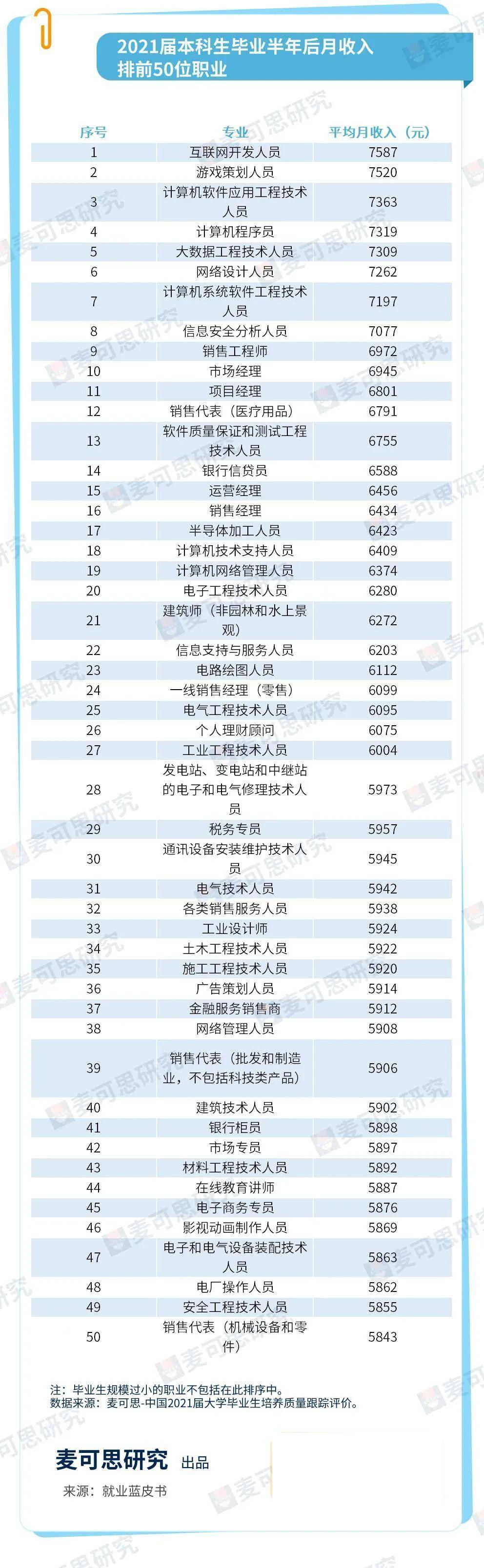 我们筛选了2021届本科生起薪较高的前50位职业。