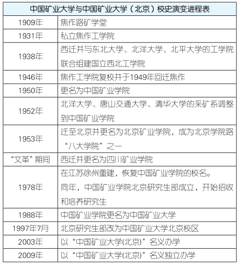 1950 年在焦作工学院的基础上创办中国矿业学院,第二年将师生及设备等主体转移至天津(剩余部分继续办学,并逐步演变为今日的河南理工大学)。1953 年学校搬迁至北京,更名为北京矿业学院。1970 年学校搬迁至四川,更名为四川矿业学院。1978 年,学校在江苏徐州重建,恢复中国矿业学院校名,并成立了中国矿业学院北京研究生部。1988 年学校正式更名为中国矿业大学(徐州),北京研究生部也在 1997 年更名为中国矿业大学(徐州)北京校区。2003 年北京校区以“中国矿业大学(徐州)(北京)”的名义办学。自此,徐州主校区和北京校区开始逐步转变为独立的办学实体。