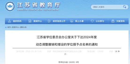 9月15日和18日,江苏省教育厅网站先后发布《江苏省学位委员会办公室关于下达2024年度学位授权自主审核单位撤销和增设的学位授予点名单的通知》《江苏省学位委员会办公室关于下达2024年度动态调整撤销和增设的学位授予点名单的通知》,共增设11所高校的24个学位点、撤销10所高校的28个学位点。同时发布《关于下达2025年超常布局学位授予点名单的通知》,新增2个超常布局学位点。