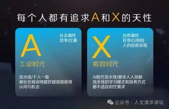 每个人天生都有追求“A”和“X”的天性:“A”是与竞争相关的社会属性,“X”是与好奇心、探索、人的自我发现相关的自然属性。近200年来,在追求标准化的工业时代,被社会规训得越好越容易获得认同与机会,因此“A型人才”受推崇。