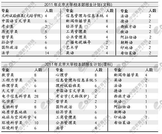 4月16日上午,北京大学召开2011年招生信息发布会,宣布北大校本部今年计划在京招生246人,其中文科96人,理科150人,文理科分别比去年计划数少招5人。