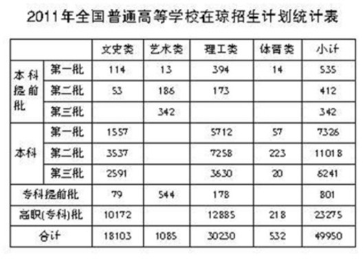 从海南省考试局获悉,海南省今年高招各批次招生计划已经确定,共有1232所高校计划在琼招生49950人,比去年增加2403个招生计划(具体的各批次招生计划见表)。其中,本科提前批、本科第一批、本科第二批和本科第三批共增加计划2135人,占总增加计划的88.8%。