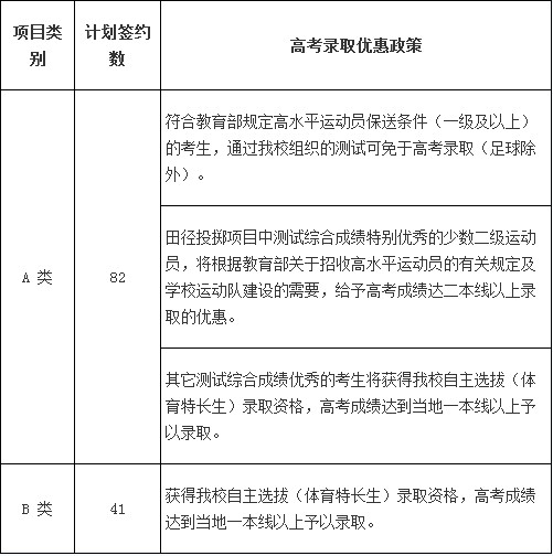 获得我校高水平运动员及体育特长生录取资格的考生,将分别获得以下高考录取优惠(以协议书为准):