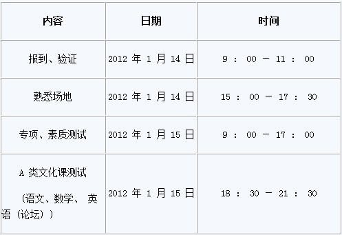 3.测试时间:2012年1月15日(具体测试时间安排见报到现场公告,敬请关注)。具体各个项目的测试时间、地点安排于报到时另行通知。