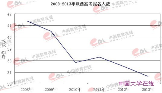 中国大学在线了解到,2013年陕西高考报名人数366498人,其中参加全国统考的考生360302人。