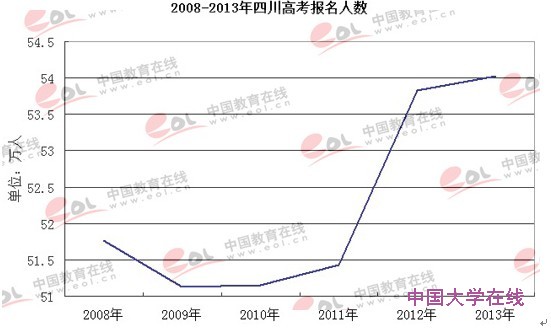 中国大学在线显示,近几年,四川高考报名人数在不断增长。2008年四川高考人数有51.76万人;2009年有51.13万人;2010年有51.15万人,2011年有51.43万人,2012年增长到了53.83万人。