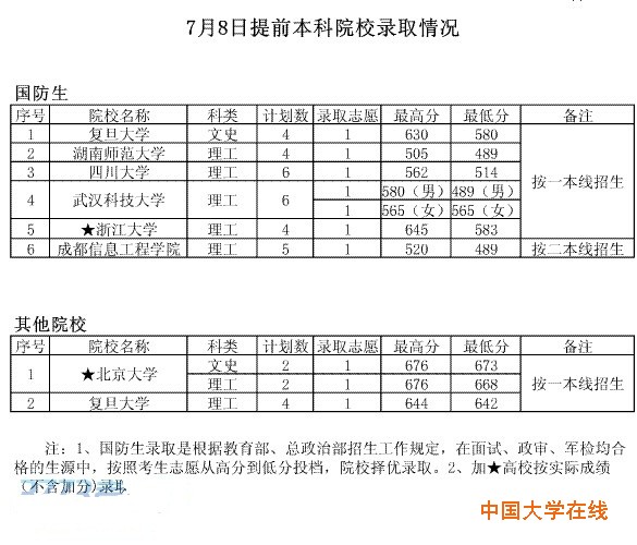 2014年7月8日贵州提前本科院校录取分数线