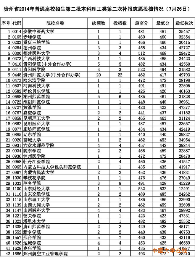 贵州省2014年普通高校招生第二批本科理工类第二次补报志愿投档情况(7月26日)