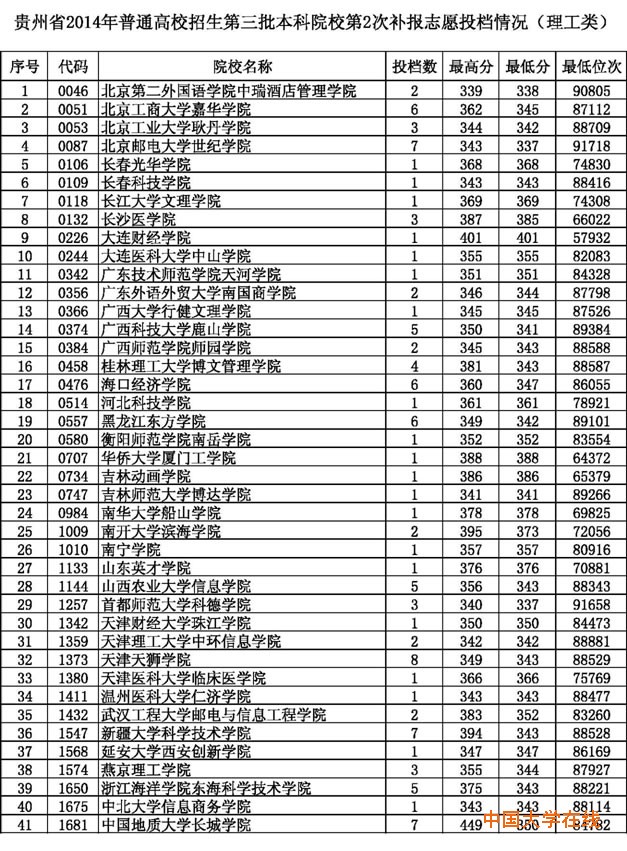贵州省2014年普通高校招生第三批本科院校第2次补报志愿投档情况(理工类)