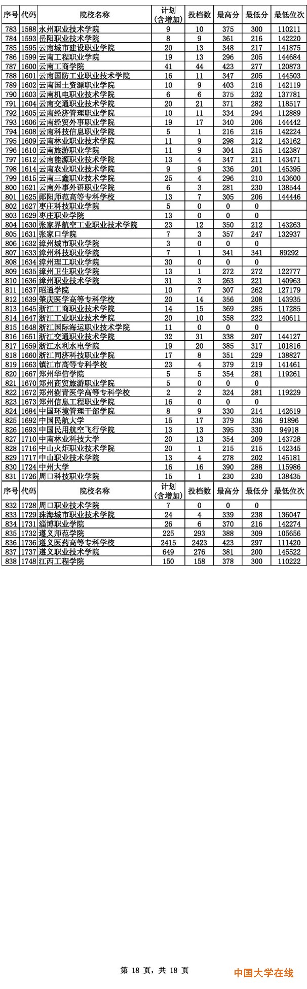 贵州省2014年普通高校招生高职(专科)平行志愿投档情况(理工类)