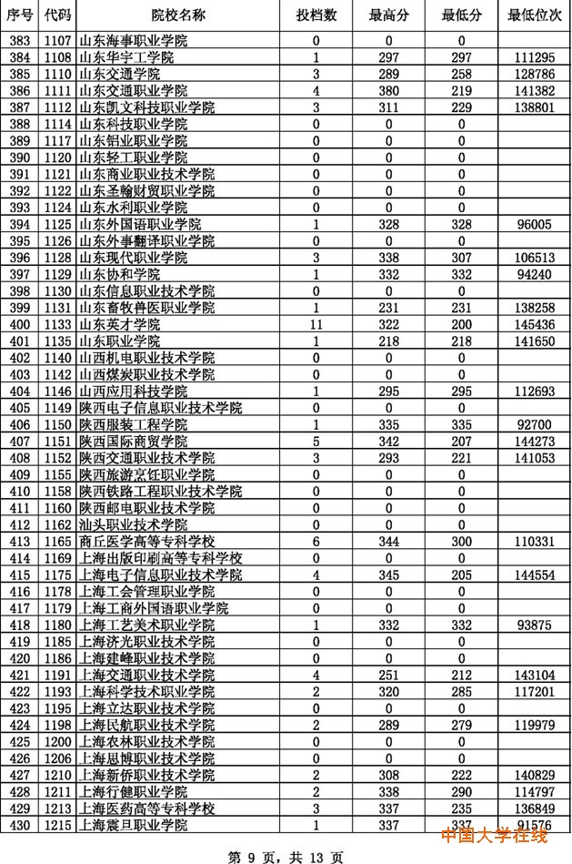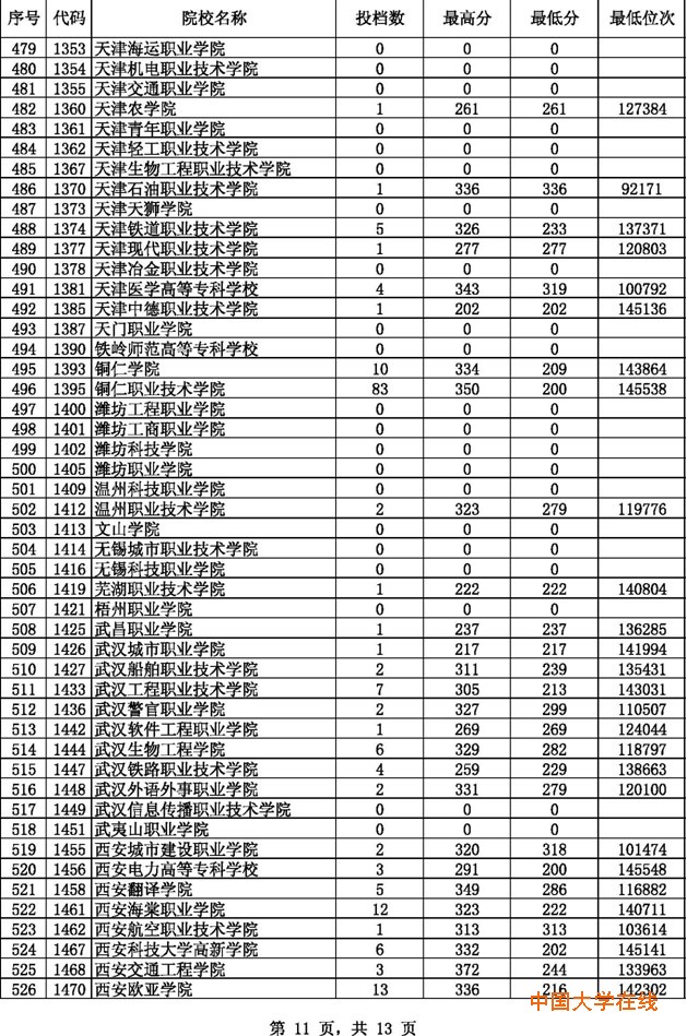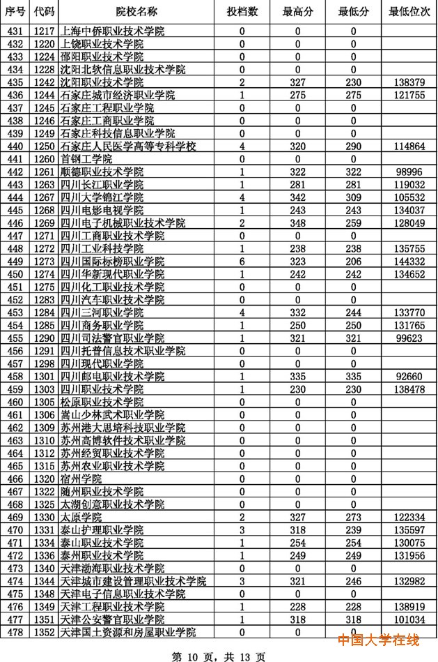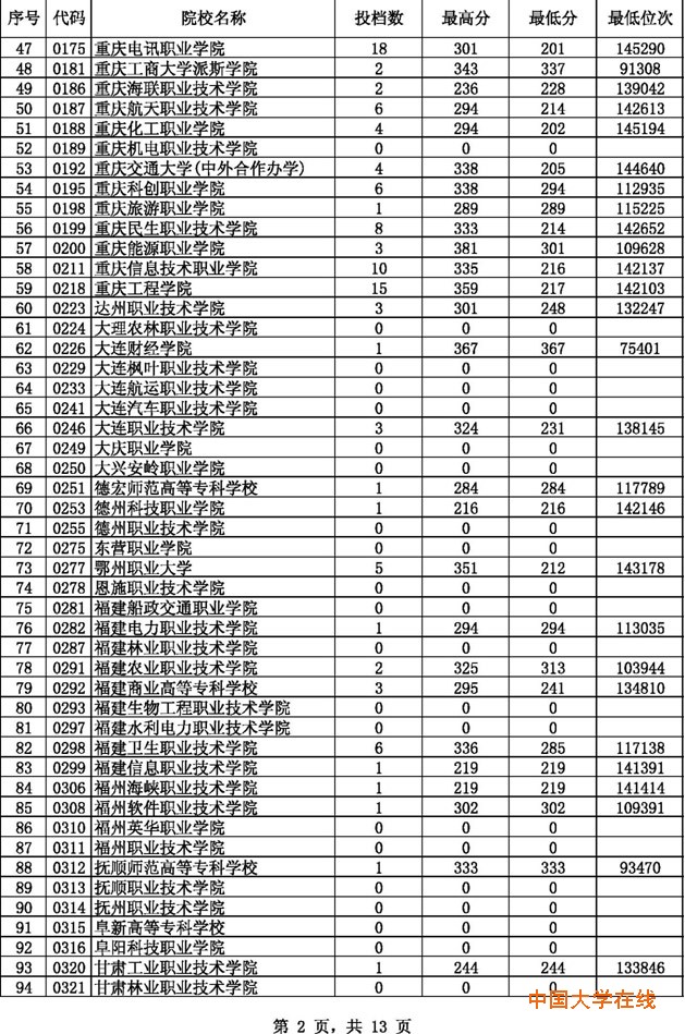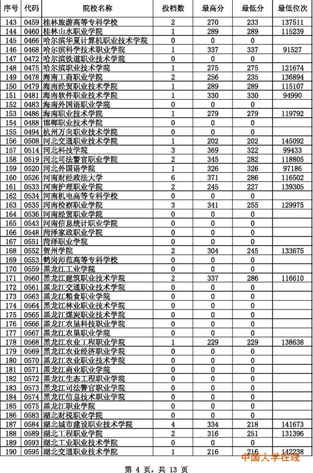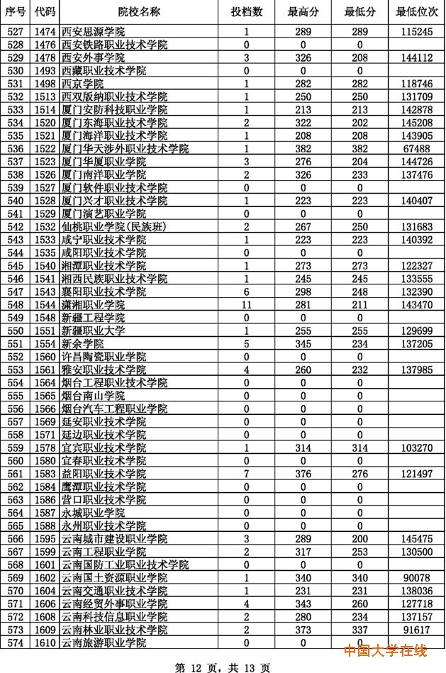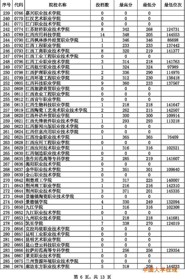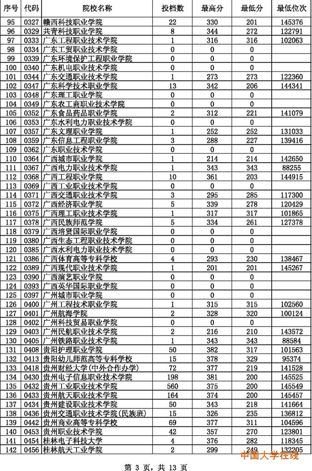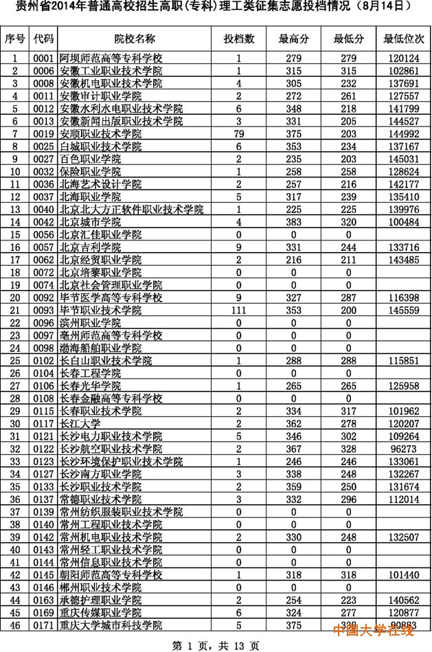 2014贵州高考专科理科征集志愿投档分数线(8月14日)