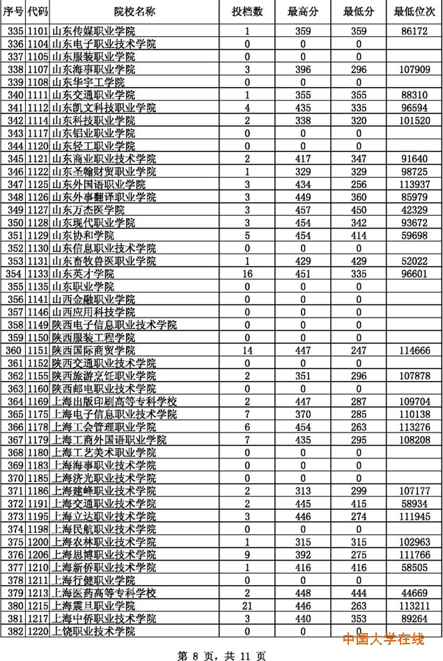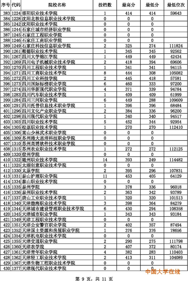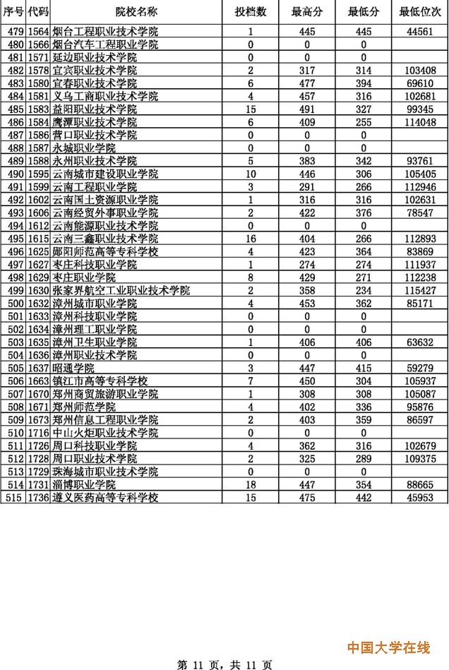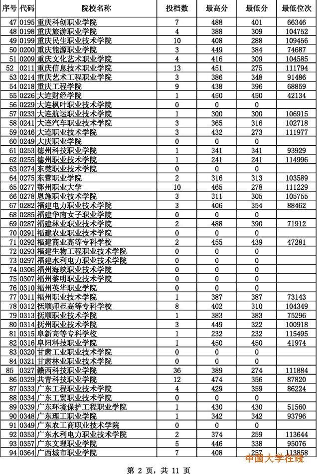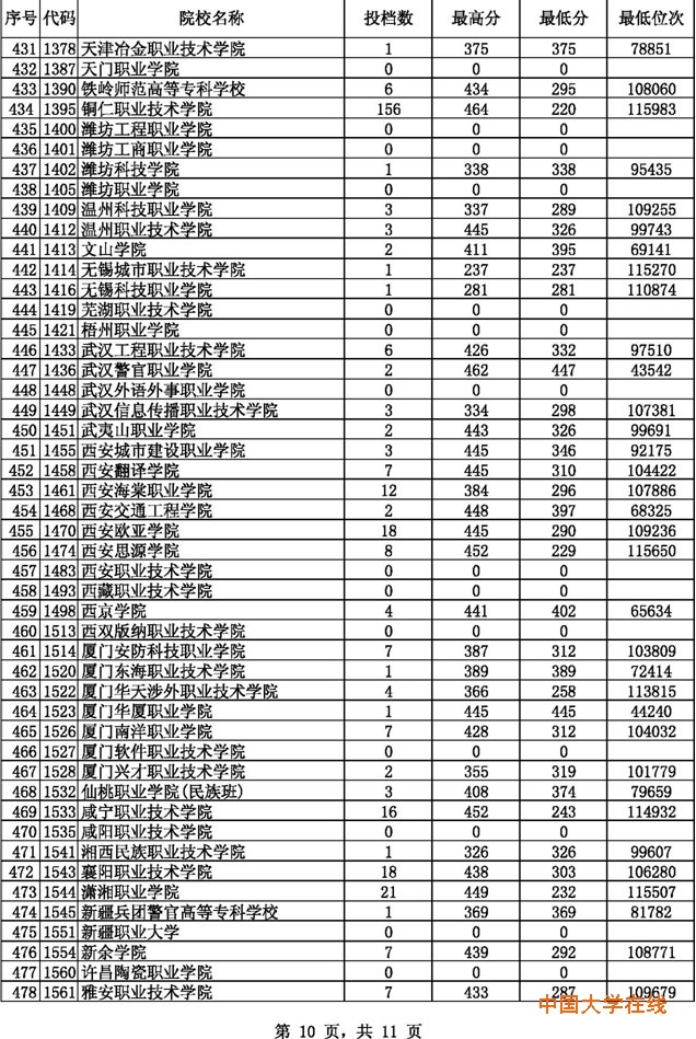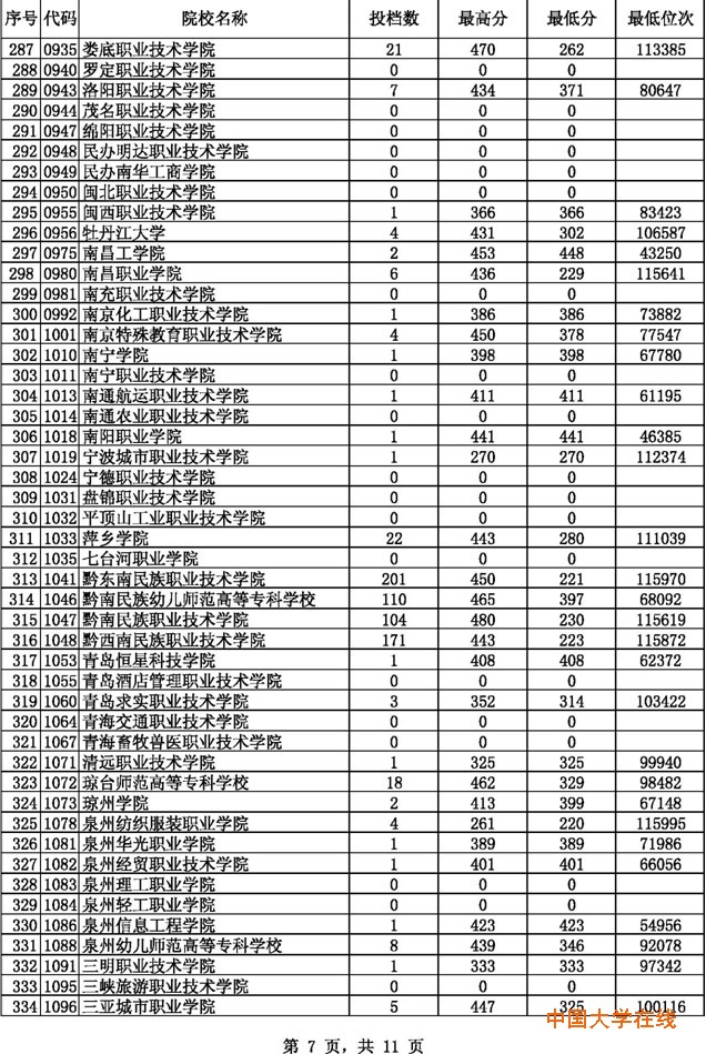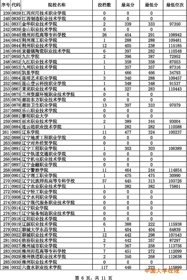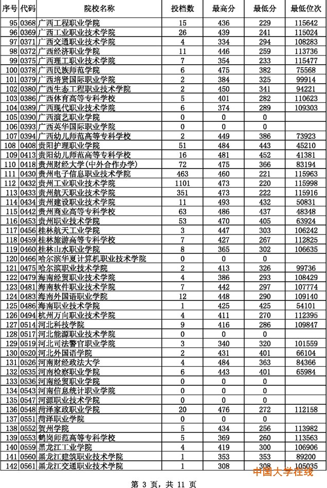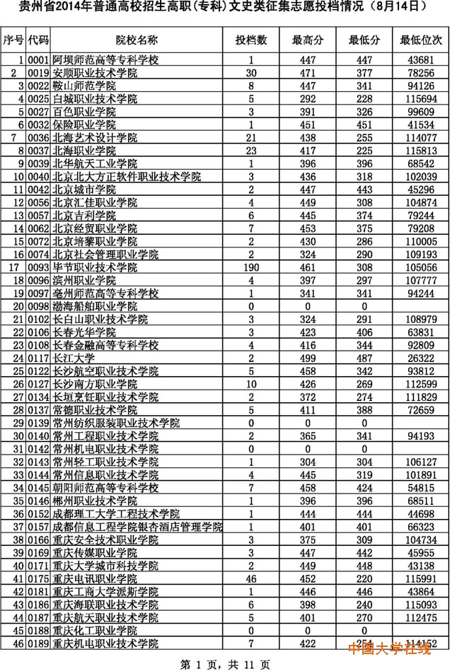 2014贵州高考专科文科征集志愿投档分数线(8月14日)