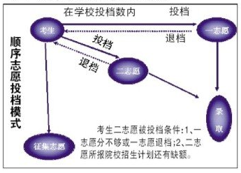 顺序志愿是指在同一个录取批次设置的多个院校志愿有先后顺序,其表述方式为:第一志愿、第二志愿,计算机投档时将相同院校志愿的考生分别排队,然后根据分数从高到低向对应的院校投档。