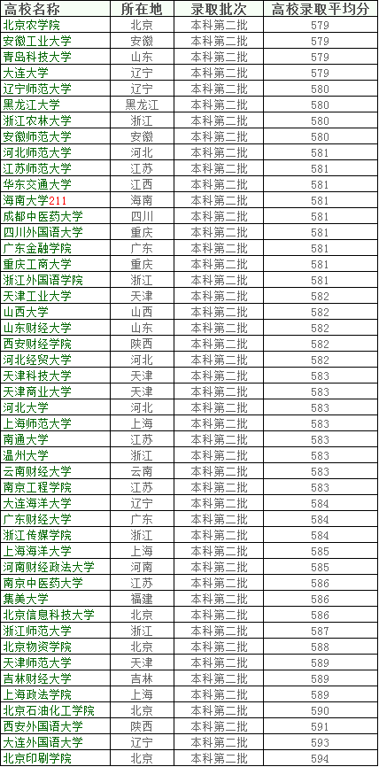 二本批次院校及其录取平均分,列表如下: