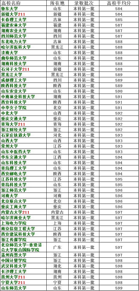 一本批次院校及其录取平均分,列表如下: