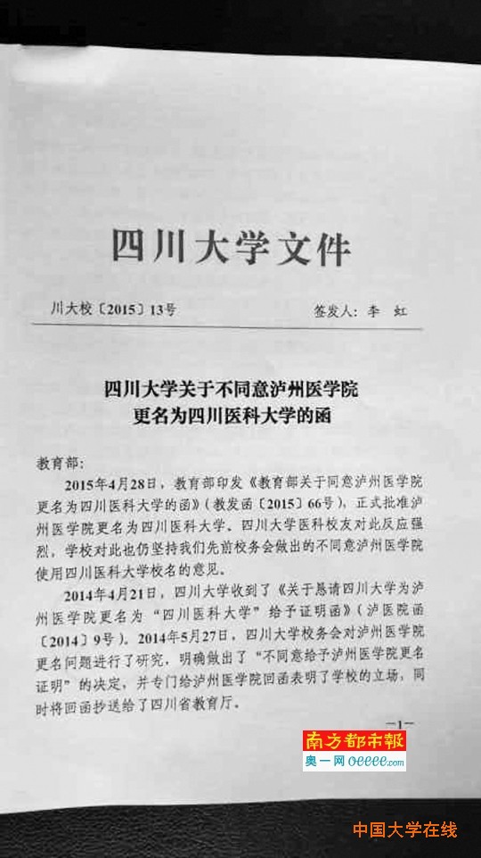 南都记者获得了一份《四川大学关于不同意泸州医学院更名为四川医科大学的函》(川大校[2015]13号),此为四川大学常务副校长李虹6月9日签发的内部文件,发往教育部。四川大学校长办公室相关负责人确认了该文件的真实性。