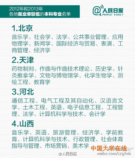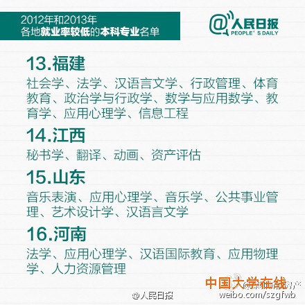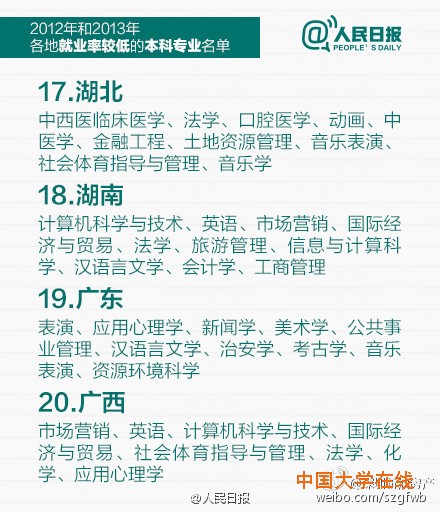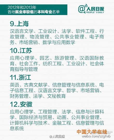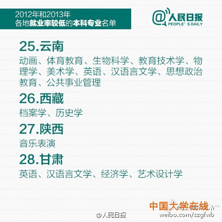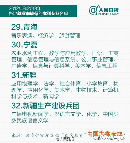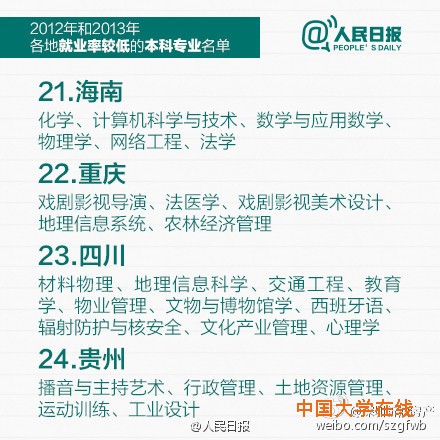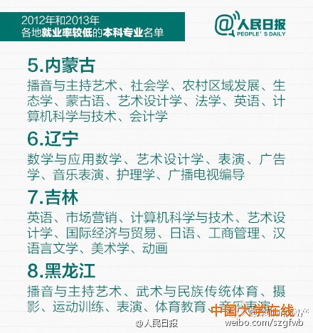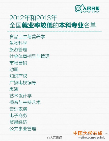 教育部公布2012和2013年就业率较低的本科专业,赶紧转给马上要填志愿的考生和家长!同时也提醒:选专业,结合个人兴趣也很重要,因为它不仅与你相伴4年,更对你将来的择业有很大影响,数据也仅供参考。(人民日报)