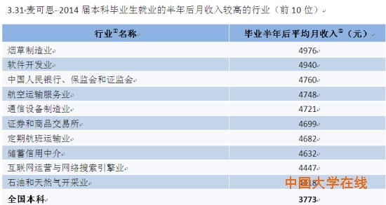 ①行业:根据麦可思中国行业分类系统,2014届半年后调查覆盖了本科毕业生所能从事的行业327个。 ②月收入:指工资、奖金、业绩提成、现金福利补贴等所有的月度现金收入。数据来源:麦可思-中国2014届大学毕业生社会需求与培养质量调查。