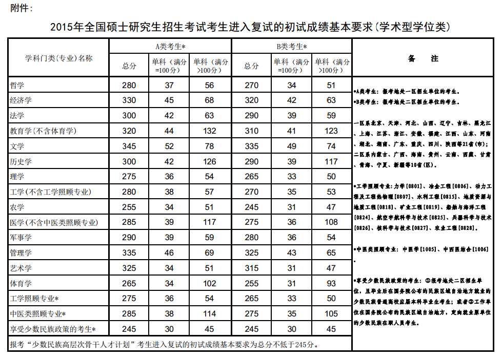 2015年全国硕士研究生招生考试考生进入复试的初试成绩基本要求(学术型学位类)