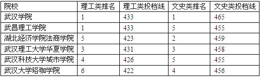 8月3日,湖北省2015年高考第三批本科院校平行志愿投档线出炉:武汉学院(原中南财经政法大学武汉学院)、武昌理工学院理工类投档线同为433分,并列湖北本地同类高校首位;与此同时,在湖北本地高校文史类投档线排名中,武汉学院文科投档线为465分,以6分优势领先排名文科第2的湖北经济学院法商学院。