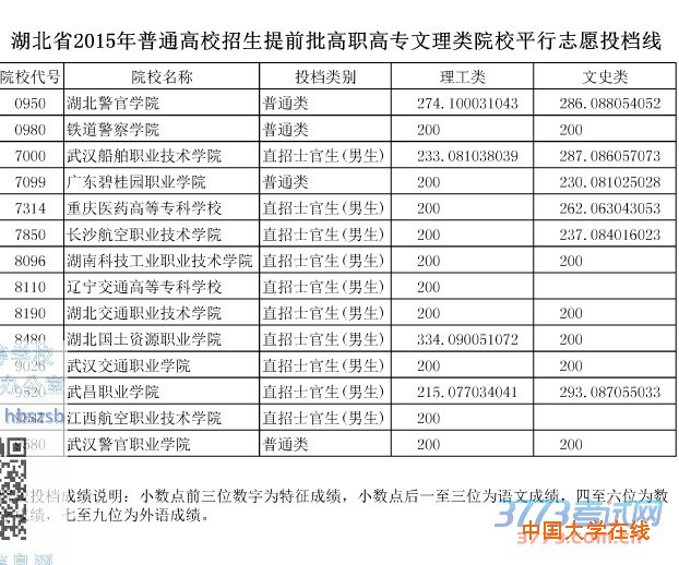 湖北省2015年普通高校招生提前批高职高专文理类院校平行志愿投档线