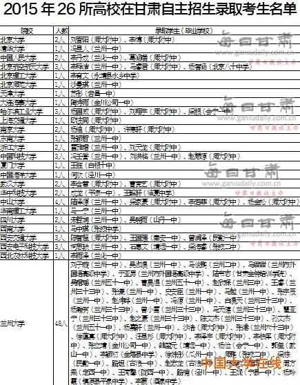 教育部公布的2015年全国具有自主招生资格的高校共有90所,其中,通过自主招生今年在我省录取考生的只有26所,另外64所高校并未在甘肃录取考生。