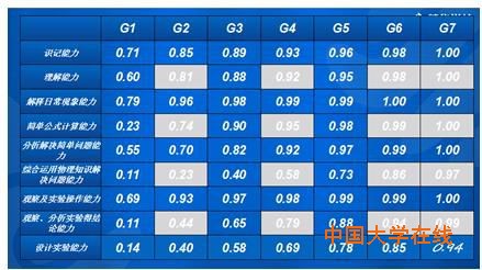 在高考这场战役中,学习能力体现在很多方面,但就针对高考成绩的提高方面来说,对学习、考试等能力的“扬长避短”则是最快速的提分方法。该表格是对北京市海淀区某考试物理成绩进行的G1-G7分组排序,G1为分数最低的一组,G7则为分数最高的一组。通过图表我们可以看出,在同一份试卷中,简单公式计算能力、分析解决简单问题能力、综合运用物理知识解决问题能力、观察分析实验得结论能力和设计实验能力的分值差距很大,差距高达52%。虽然难度有异,过分追求补难题反而得不偿失。但不难从表中看出,差距值越大,说明在这些能力上加强后提分的空间最大,而简单公式计算能力、分析解决简单问题能力、综合运用物理知识解决问题能力普遍适用于所有考生,因此,“扬长避短”地有针对性地进行能力培训,才能有效达到提分目标。
