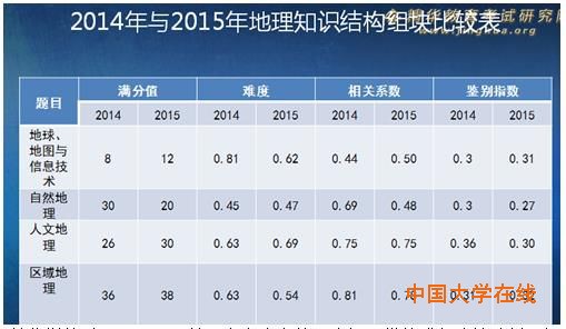 精华学校对2014-2015地理高考内容的四大知识模块进行比较分析,分别从满分值、难度、相关系数以及鉴别指数等方面得出一定说明性的数据,我们可以看到不同题目的满分值升高,难度却在下降,而有些题目满分值降低,难度却增加。考生如果对此类数据不明确就可能在复习的过程中造成本末倒置的现象,将已经降低分值的非重点知识模块当做复习重点,浪费大量时间。